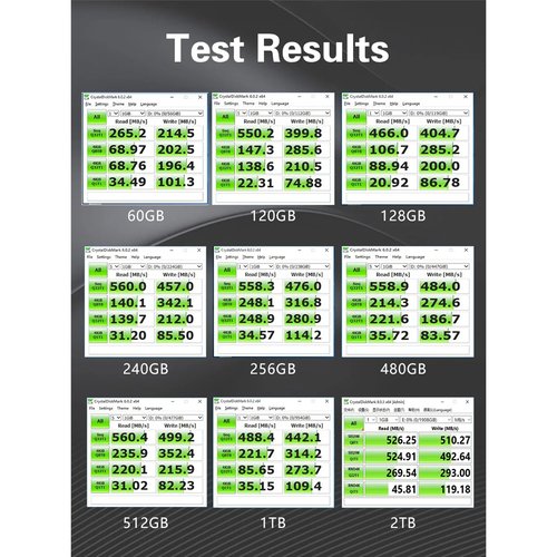 - Скорость чтения (МАКС.): 550 МБ/с; Скорость записи (МАКС.): 500 МБ/с.