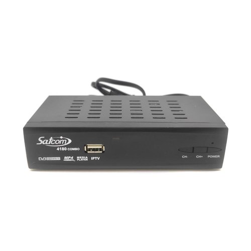 Комбинированный HD ресивер Satcom 4180 COMBO HD – бюджетный комбинированный HD ресивер от известного бренда Satcom. В новой модели тюнера в отличии от других моделей есть в наличии обучаемый пульт дистанционного управления. Тюнер Satcom 4180 COMBO HD является цифровым комбинированным ресивером с функцией записи и воспроизведения с USB носителя. Ресивер предназначен для приема спутниковых DVB-S2, наземных цифровых DVB-T2 каналов, а также каналов кабельного телевидения DVB-C в стандартной и в высокой четкости (Full HD). Тюнер имеет металлический корпус черного цвета со встроенным блоком питания. В корпусе тюнера производителем сделаны перфорированные отверстия для улучшения вентиляции. На передней панели ресивера размещены основные кнопки управления, LED дисплей и USB порт для проигрывания мультимедийного контента с накопителей. На задней стороне ресивера расположены видеовыходы 3RCA и HDMI для подключения к современным телевизорам, антенные входы и второй USB порт.