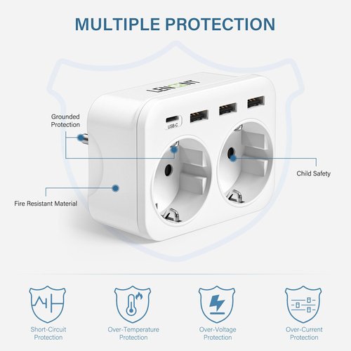 Сетевой разветвитель Lencent имеет 2 розетки, 3 порта USB и 1 порт type C — идеальная комбинация, которую можно использовать для нескольких устройств одновременно. Например, для компьютеров, мобильных телефонов, планшетов, устройств с USB-портами и т. д. Вилка очень тихая и не издает шума.