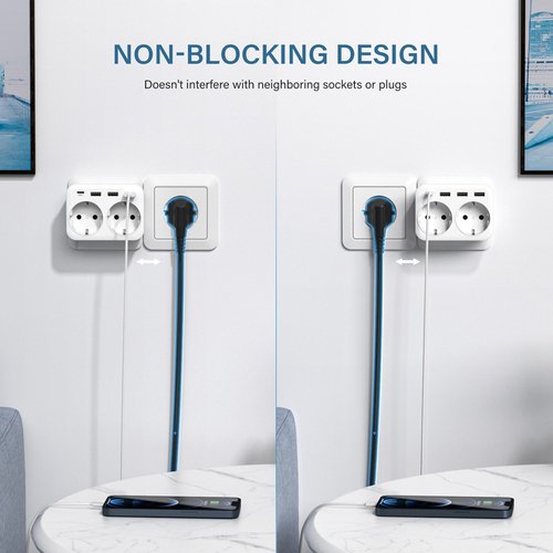 Уникальная конструкция розетки позволяет одновременно подключать 2 большие розетки, 3 порта USB и 1 порт Type-C, не мешая использованию соседних розеток.