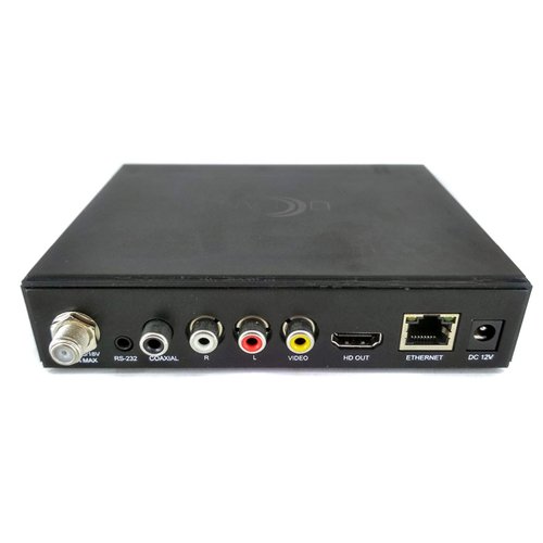 На лицевой части Denys H.265 PRO расположен информативный дисплей (табло) который отражает номер канала и/или время (отображение можно отрегулировать в настройках), сбоку расположены 2 USB разъема и разъем для подключения выносного ИК-приемника (который идет в комплекте). Выносной ИК-приемник позволит спрятать ресивер например за телевизор оставив на видимой части только датчик приема сигналов пульта ДУ.