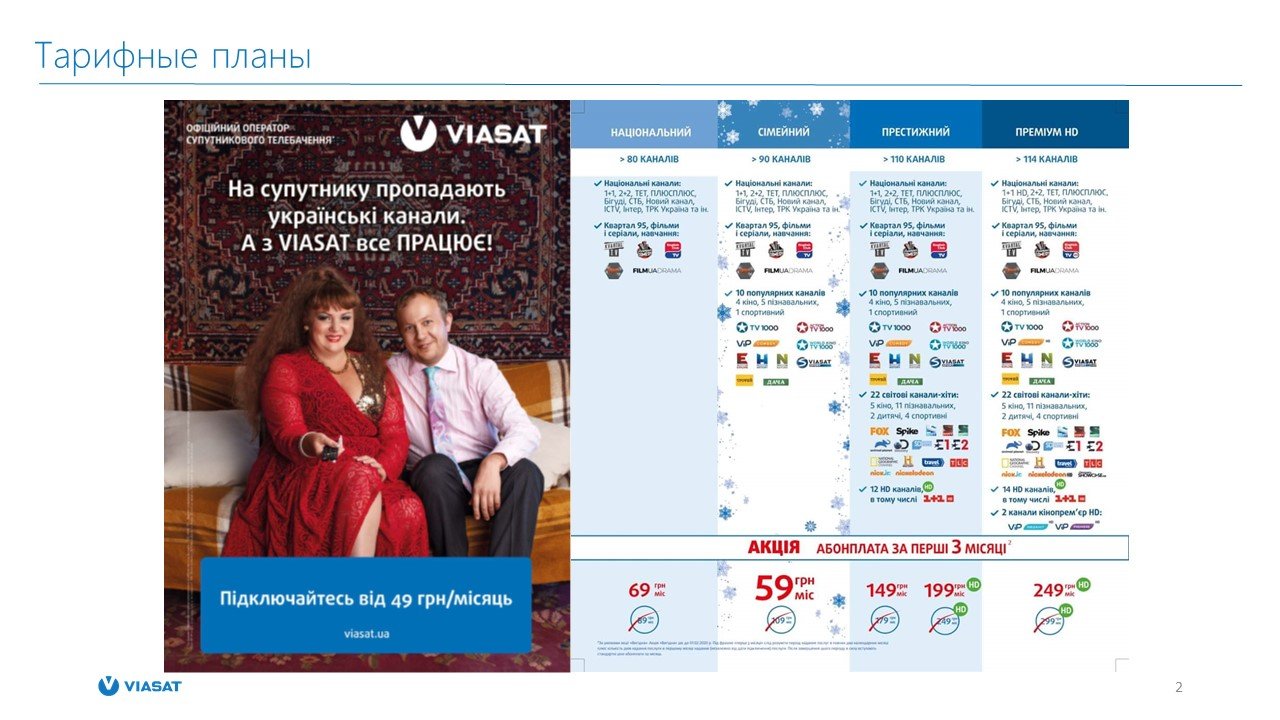 Viasat предлагает широкую тарифную линейку от 49 до 249 грн в месяц, в которой доступны как пакеты с максимальным количеством мировых каналов хитов, так и оптимальные пакеты с набором основных украинских рейтинговых телеканалов. Можно выбрать пакет на любой вкус - кино, спортивные или информационно-развлекательные каналы, в HD или стандартном качестве, только для себя или для всей семьи! Кроме того, в любое время можно подключить дополнительный телевизор за 69 грн/месяц, изменить свой пакет или заказать дополнительно каналы с премьерами и хитами кино, а также каналы для взрослых за 59 и 39 грн в месяц соответственно.