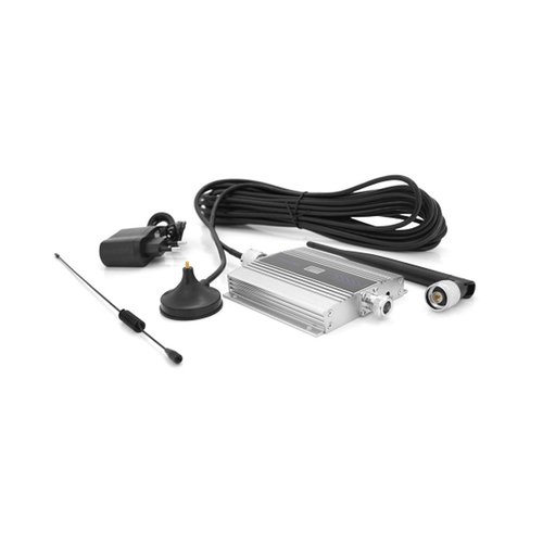 Пристрій працює від мережі 220В та може бути встановлений на столі, полиці, підвіконні або стіні (с помощью спеціальніх кріплень). Від нього йде довгий кабель довжиною 10м, який під'єднується до антени, встановленої на фасаді будівлі. Вона виконує функцію прийому радіосігналу від віддаленої станції. Друга антена набагато менше в розмірах і кріпиться прямо до репітеру. Вона роздає сигнал в пріміщенні зі слабким зв'язком. Все перераховане йде в комплекті.