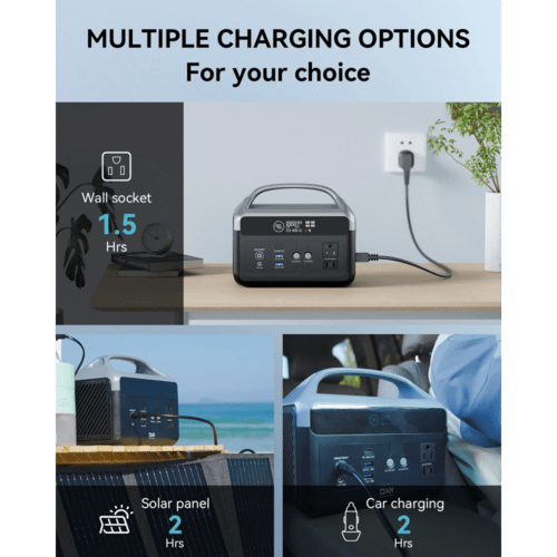 - Три способа быстрой зарядки: за 1.5 часа до 100% сетевой розетки с максимальной мощностью 120W; за 2 часа до 100% от гнезда прикуривателя автомобиля или солнечной панели (MPPT 90W Max (11-30V 4A Max)).
