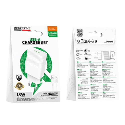Сетевое зарядное устройство Borofone BAS72A поддерживает быструю зарядку и подходит для современных смартфонов и гаджетов. Благодаря поддержке протоколов QC3.0 и других стандартов устройство обеспечивает эффективную зарядку за минимальное время. Один USB-порт выдает мощность до 18W и автоматически подстраивается под подключенное устройство. В комплект входит кабель USB-A – Micro-USB, что делает зарядное устройство готовым к использованию сразу после покупки. Прочный корпус из ABS-пластика и компактные размеры удобны для повседневного использования и поездок. Многоуровневая система защиты обеспечивает надежную работу.