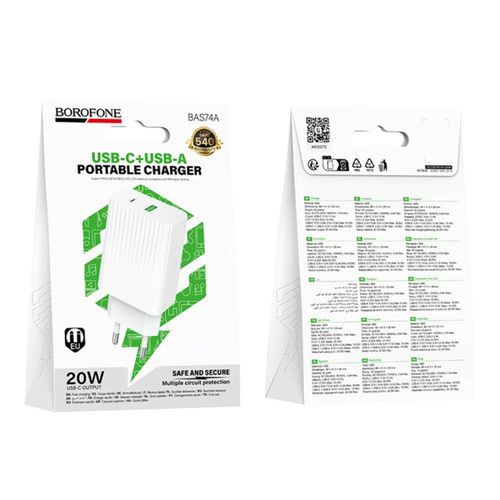 Теги: Зарядное устройство для Borofone BAS74A 1USB-C/1USB PD/QC 20W (Белый), Borofone, зарядное устройство, USB Type-C, USB-A, быстрая зарядка, PD 20W, QC3.0