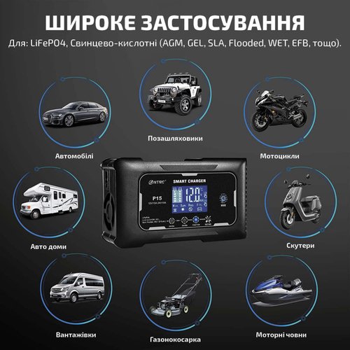 Зарядное устройство HTRC P15 поддерживает зарядку аккумуляторных батарей с напряжением 12 В и 24 В, имеет переключатель тока на 5, 10, 15 А, а также поддерживает зарядку различных типов батарей: SLA, Flooded, VRLA, WET, AGM, GEL, EFB, EFB, CA/CA, Lithium і LiFePO4. Длинные провода значительно упрощают процесс работы с зарядным устройством, предоставляя большее удобство и доступ к устройству.