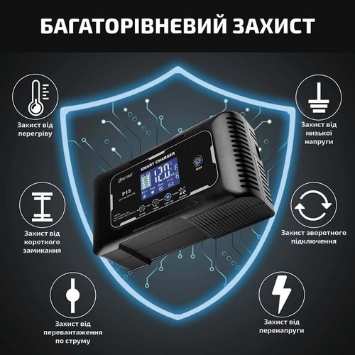 - Автоматическое процессорное управление. Девяти этапная зарядная программа обеспечивает наиболее эффективный результат.